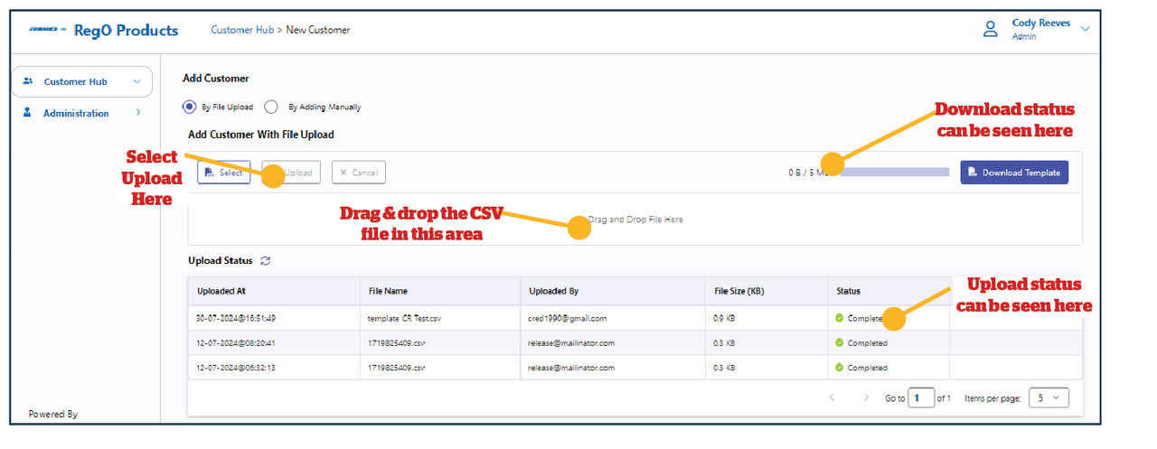 Customers may be added manually one entry at a time, or via a bulk upload using a CSV file template provided in the upload screen.